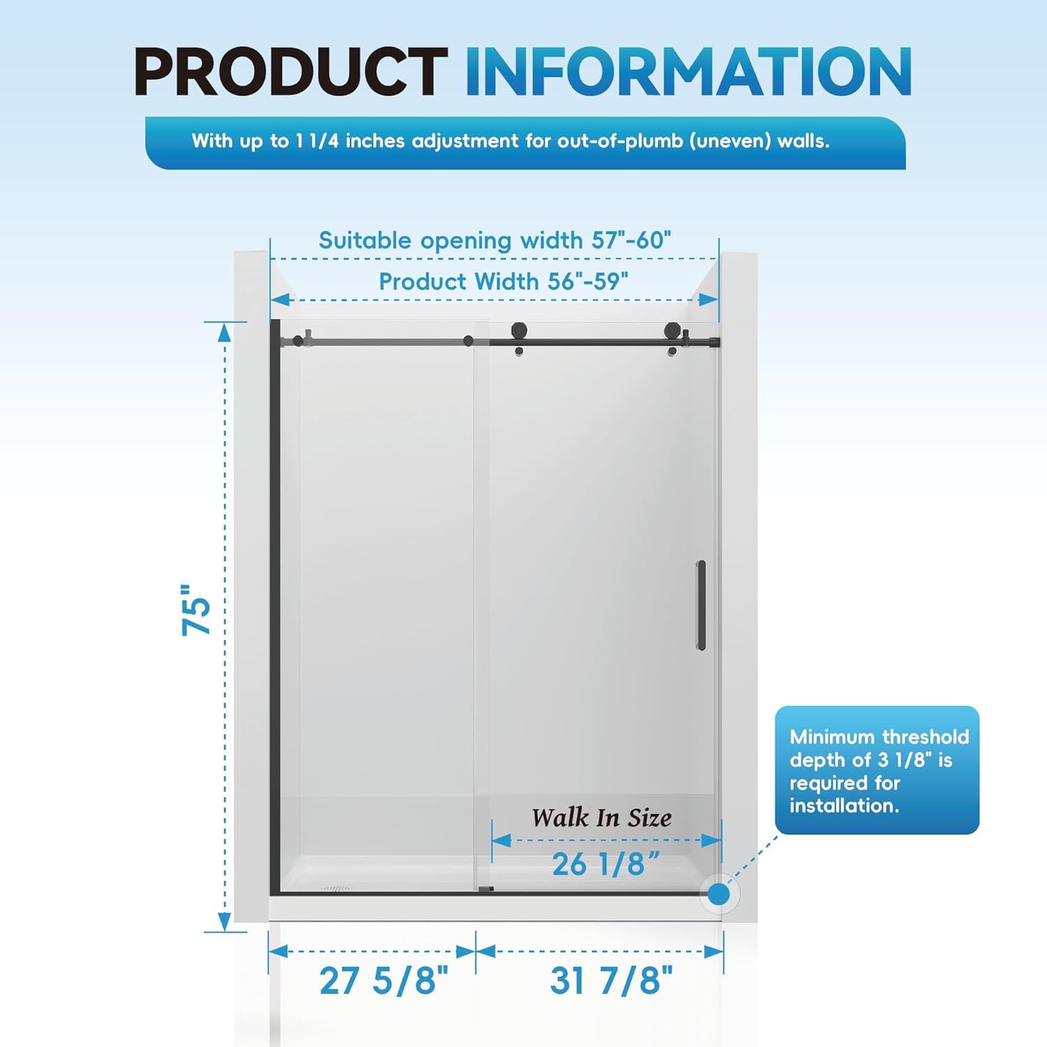 Adjustable Size: Fits 55–59" W x 75" H spaces. Door width 31-7/8" with walk-in space 26-1/6". Stainless steel top rail can be trimmed up to 4" for perfect width adjustment. Overall width adjustable: 56–60".