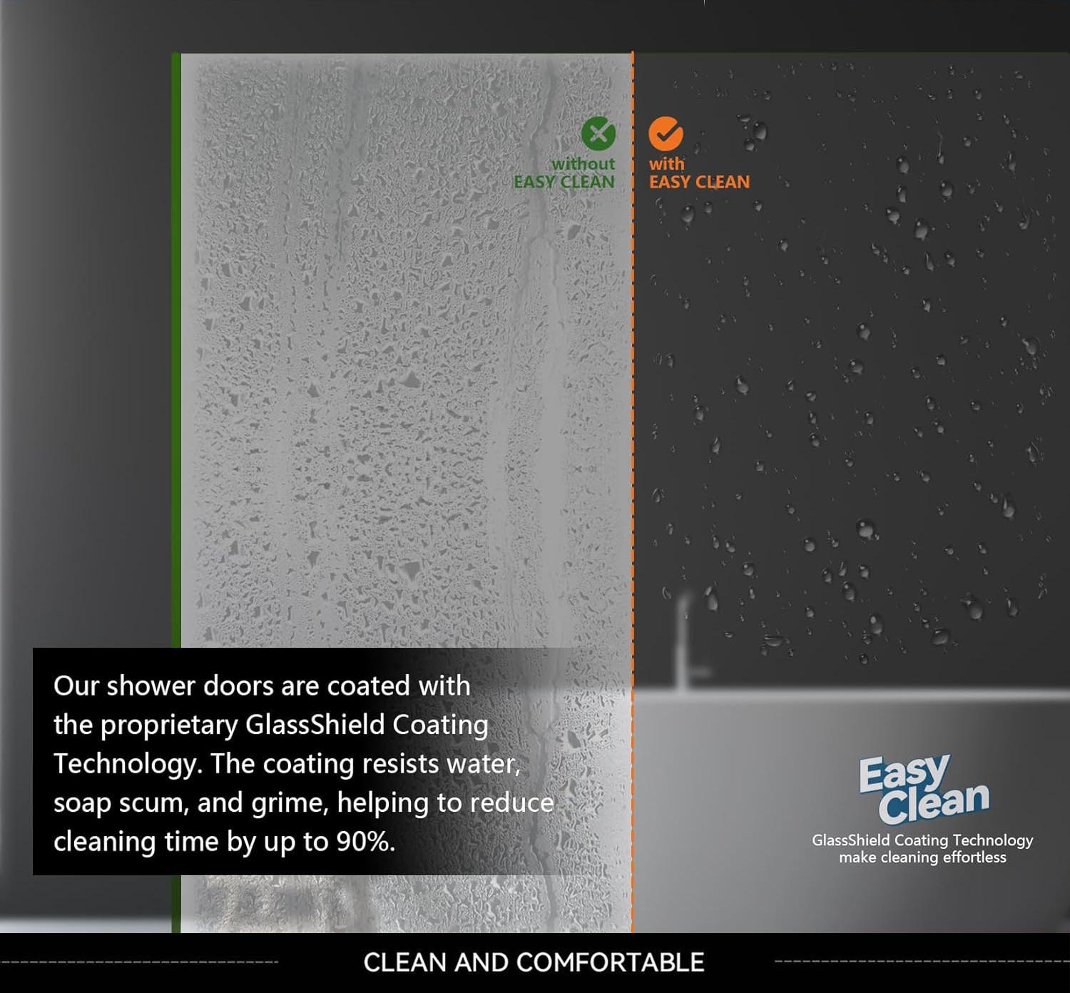 - Easy-Clean Glass Coating: Made of ANSI Z97.1 certified clear tempered glass (1/4 inch thick), featuring double-sided easy-clean coating that resists water spots, soap scum, and buildup β making routine cleaning effortless.