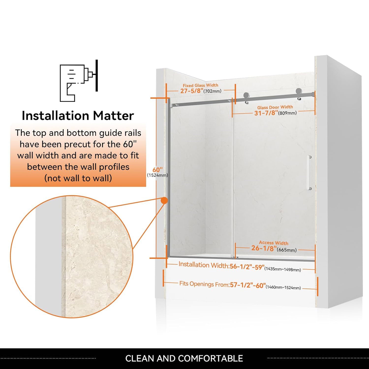 Designed for a width range of 57 1/2" to 59" and a fixed height of 60", this tub door is ideal for standard 60-inch bathtub openings. Top and bottom rails can be trimmed by up to 1 7/8" for a precision fit.